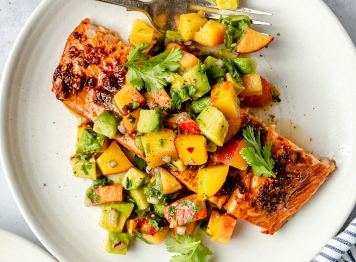 Hello, gorgeous salmon filets with the best sweet and spicy marinade topped with fresh avocado peach salsa....