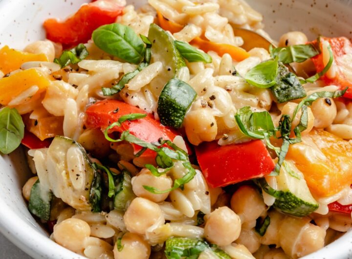 A savory summer dish you’re going to LOVE: this 30 minute grilled vegetable orzo is filled with...
