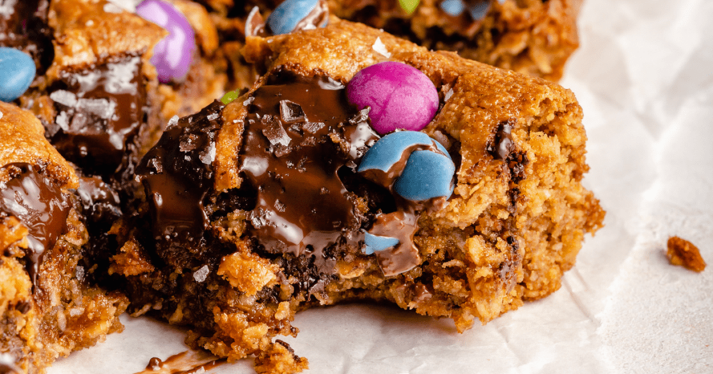 Gooey and delicious monster cookie bars filled with the best add-ins like shredded coconut, chocolate chunks, and chocolate candies! These dairy free and gluten free monster cookie bars are made with creamy tahini instead of peanut butter and make an incredible dessert for kiddos and adults.