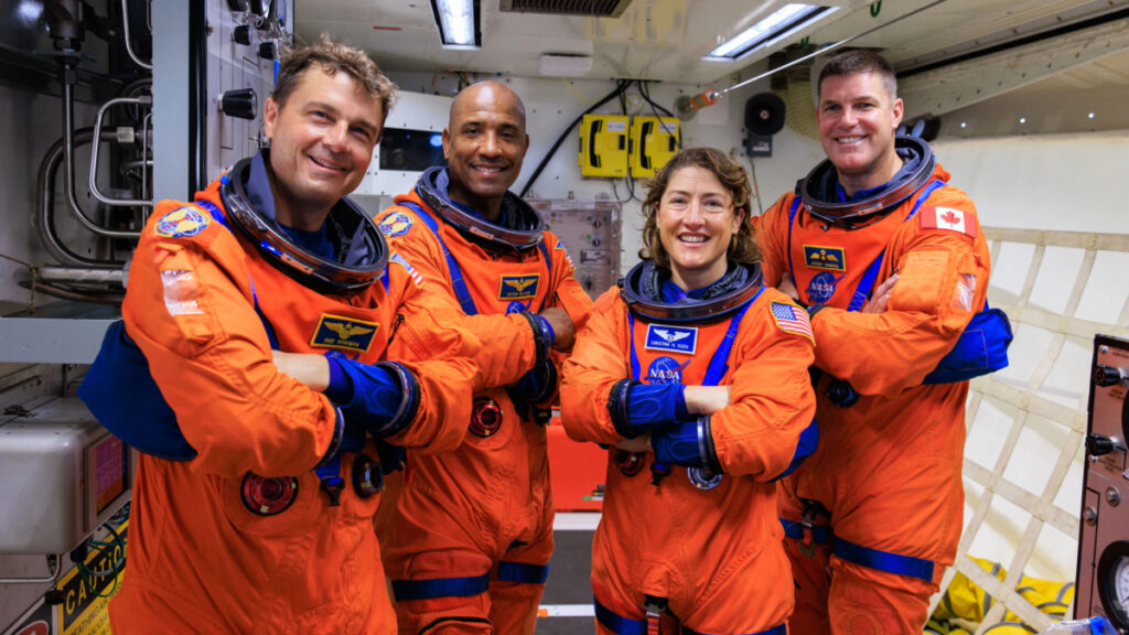 Iš kairės į dešinę: Artemis II NASA astronautai Reidas Wisemanas, Viktoras Gloveris ir Christina Koch bei CSA (Kanados kosmoso agentūra) astronautas Jeremy Hansenas.
